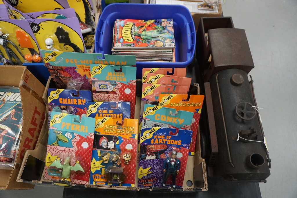 1000’s of estate fresh comic books from Golden Age to Contemporary including Conan The Barbarian, G.I Joe, Star Trek, Archie, Disney, Dark Shadows, Munsters, “2” copies Batman #181 1st Poison Ivy (1 complete with Batman & Robin Centerfold), Scooby Doo, Green Hornet, various Super Hero, many, many lots of Dell, Gold Key, Marvel, DC and independent publishers, many Key issues! Huge collection of Dungeon & Dragons (D&D) modules, hardcover and softbound manuals, miniatures, and related role playing games, extensive magazine collection covering sports, pop culture celebrities, etc, Sports and Non-sports trading Cards Three Stooges, Beatles, Monkees, Dark Shadows, etc, CGC graded comics, cast pewter vehicles and ornaments, many lots of 1st Gear Trucks and vehicles, Hess Trucks, Large vintage Train Collection Lionel, American Flyer, etc, various home video games- Nintendo, etc, pocket digest books, huge collection of Lps, 45’s, cds, VHS Tapes, Dvds and related entertainment, Vintage Halloween, American Girl Dolls, Barbie and Friends, character PEZ dispensers, Character Toys, Movie Memorabilia, Corgi Cars mint with original boxes, Hot Wheels & matchbox vehicles, Original owner Star Wars action figure and vehicle collection many with boxes and manuals, Halloween Masks and costumes, original Ghost Busters Firehous with box, original Hall of Justice, TMNT, Pee-Wee, Mars Attacks, Plush Toys, Movie Posters, Nightmare Before Christmas toys, Slot Cars, Lego Sets, Die Cast Vehicles, Games, Models, etc, etc…